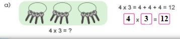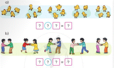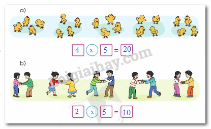 - Đếm số con gà trong mỗi nhóm và số nhóm rồi viết phép nhân thích hợp.
