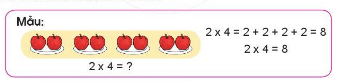 Tình huống 1: Mẹ có 2 bình hoa, mỗi bình có 5 bông nên số bông hoa là 2 × 5 = 10 bông.