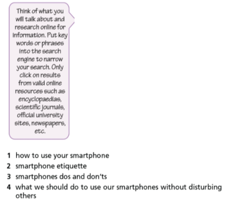 1. Read the task. What is the purpose of the presentation? 2. Which two key phrases are the most appropriate to research the topic in Exercise 1. 3. Match the idea (1-4) to the key points (a-d). 4. Use your notes to prepare your presentation. Praceitce before you do it in front of class. You can start like this: