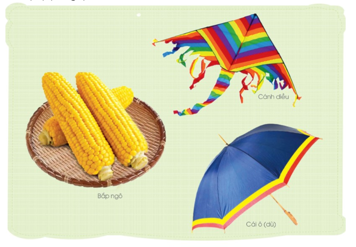 Em hãy đọc tên các màu cơ bản có trong hình: bắp ngô, cánh diều, cái ô (dù)