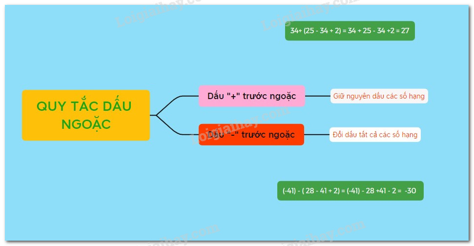 + Đặt dấu ngoặc để nhóm các số hạng một cách tùy ý. Nếu trước dấu ngoặc là dấu “-” thì phải đổi dấu tất cả các số hạng trong ngoặc.