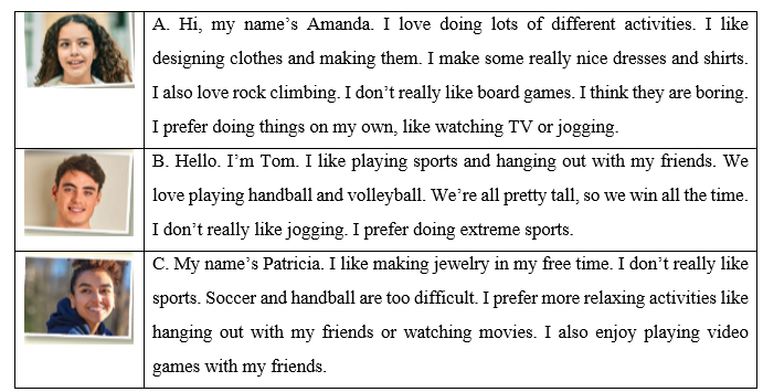 Part 2: Read the passages about the hobbies three students like to do. Choose the correct answer (A, B, or C).