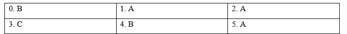 (Phần 1: Bạn sẽ nghe 5 đoạn hội thoại ngắn. Bạn sẽ nghe mỗi đoạn hội thoại hai lần. Có một câu hỏi cho mỗi cuộc trò chuyện. Đối với mỗi câu hỏi, hãy chọn câu trả lời đúng (A, B hoặc C))