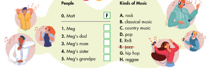 (Bạn sẽ nghe Meg nói chuyện với Matt về âm nhạc. Thể loại âm nhạc yêu thích của mỗi người là gì? Với câu hỏi 1 - 5, viết một chữ cái (A -H) bên cạnh mỗi người. Bạn sẽ nghe hội thoại hai lần)