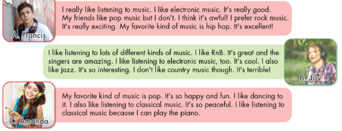 Read the paragraph about the music three students like to listen to. Choose the correct answer (A, B or C)