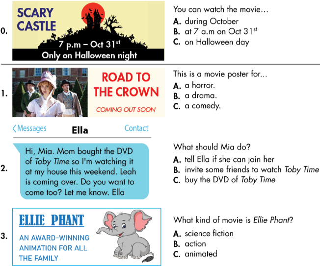 (Nhìn và đọc. Chọn câu trả lời đúng (A, B hoặc C).)