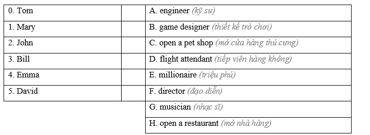 (Phần 1: Bạn sẽ nghe Tom nói với mẹ về những giấc mơ của cậu và bạn cậu. Công việc mơ ước của mỗi người là gì? Đối với mỗi câu hỏi, hãy viết một chữ cái (A-H) bên cạnh mỗi người. Bạn sẽ nghe đoạn hội thoại hai lần.)
