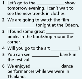 (Điền vào chỗ trống với second -hand, live, fashion, exhibition, tradiitional hoặc premiere.)