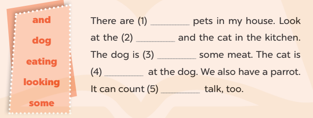 There are some pets in my house. Look at the dog and the cat in the kitchen. The dog is eating some meat. The cat is looking at the dog. We also have a parrot. It can count and talk, too.