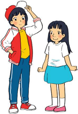 Lan is the girl wearing a red and white jacket and a red cap. Chi is the girl wearing a white T-shirt and a blue skirt.