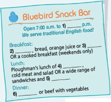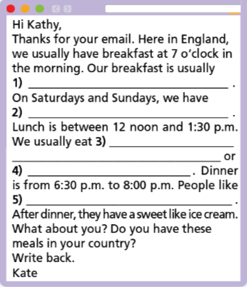 Thanks for your email. Here in England, we usually have breakfast at 7 o'clock in the morning. Our breakfast is usually 1) cereal, bread and orange juice or tea. On Saturdays and Sundays, we have 2) a cooked breakfast. Lunch is between 12 noon and 1:30 p.m. We usually eat 3) a ploughman's lunch of cheese, cold meat and salad or 4) sandwiches and fruit. Dinner is from 6:30 p.m. to 8:00 p.m. People like 5) chicken or beef with vegetables. After dinner, they have a sweet like ice cream.