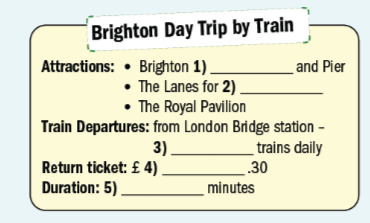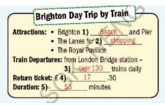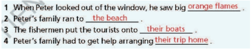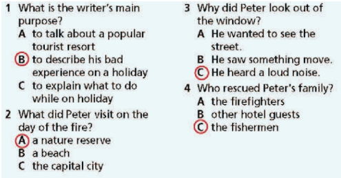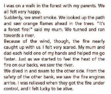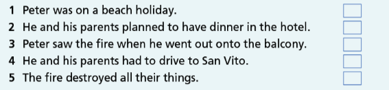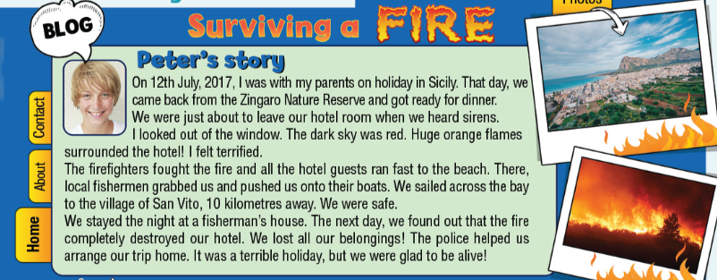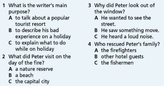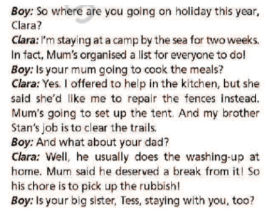 1. Read the text and decide if the statements (1-5) are R (right), W (wrong) or DS (doesn’t say). 2. Read the text again and complete the sentence. 3. Read the text again. For question (1-4), choose the correct answer (A, B or C). 4. Listen to Kelly telling the story of a forest fire. Put picture (A-D) in the order. 5. Listen to an advert and complete the leaflet. 6. Listen to Clara talking to a friend about doing chores on holiday. Match the people (1-5) to the correct chores (a-f). 7. Read the