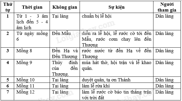 Hãy tóm tắt tiến trình diễn ra hội Gióng bằng một bảng với các nội dung: thứ tự, thời gian, không gian, sự kiện, người tham gia.