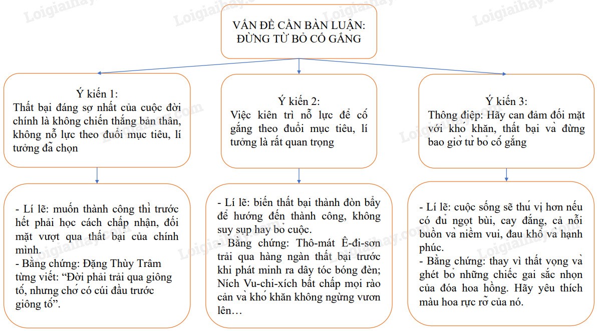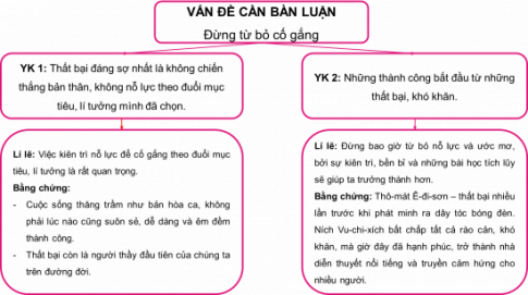- Lí lẽ: muốn thành công thì trước hết phải học cách chấp nhận, đối mặt vượt qua thất bại của chính mình. - Bằng chứng: Đặng Thùy Trâm từng viết: “Đời phải trải qua giông tố, nhưng chó có cúi đầu trước giông tố”. - Lí lẽ: biến thất bại thành đòn bẩy để hướng đến thành công, không suy sụp hay bỏ cuộc. - Bằng chứng: Thô-mát Ê-đi-sơn trải qua hàng ngàn thất bại trước khi phát minh ra dây tóc bóng đèn; Ních Vu-chi-xích bất chấp mọi rào cản và khó khăn không ngừng vươn lên,… - Lí lẽ: cuộc sống sẽ thú vị hơn nếu có đủ ngọt bùi, cay đắng, cả nỗi buồn và niềm vui, đau khổ và hạnh phúc. - Bằng chứng: thay vì thất vọng và ghét bỏ những chiếc gai sắc nhọn của đóa hoa hồng. Hãy yêu thích màu hoa rực rỡ của nó. |