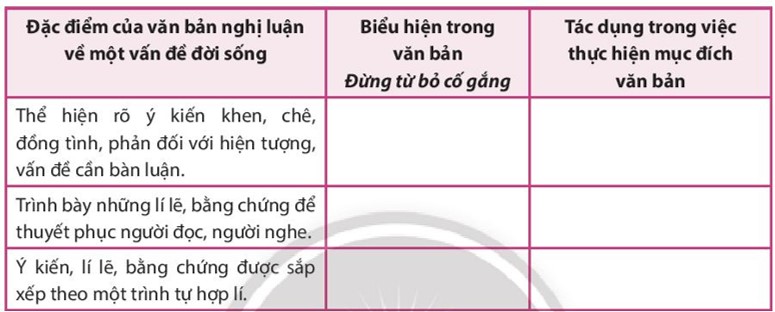 Chỉ ra những đặc điểm của văn bản nghị luận về một vấn đề đời sống trong Đừng từ bỏ cố gắng và tác dụng của các đặc điểm ấy trong việc thực hiện mục đích văn bản dựa vào bảng sau: