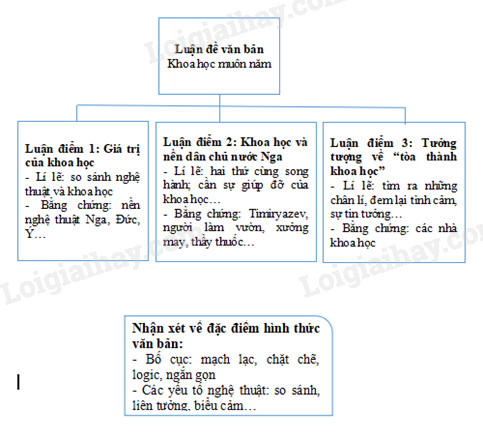 | Văn bản Khoa học muôn năm nêu lên giá trị của khoa học và nghệ thuật, mối quan hệ giữa khoa học và nghệ thuật. Qua văn bản, tác giả đem tới những thông tin thiết thực, lí thú về giá trị của một nền khoa học. |