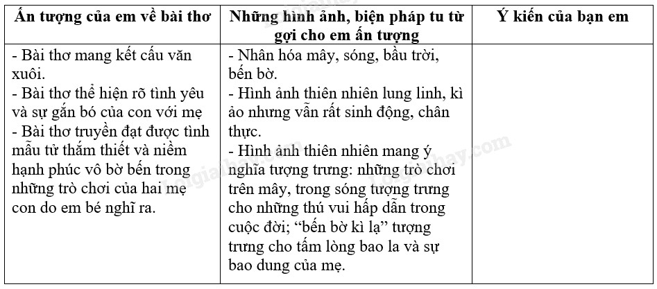 - Bài thơ mang một phong cách khác lại với kết cấu của những bài thơ bình thường, đó là bài thơ văn xuôi. - Khi đọc bài thơ em có thể cảm nhận rõ được tình yêu và sự gắn bó của con với mẹ thể hiện qua hai cuộc đối thoại với những người trên mây và trong sóng. |