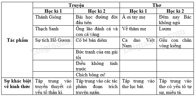 Thống kê các văn bản văn học (truyện, thơ) đã học ở hai tập sách Ngữ văn 6; từ đó, nhận xét sự khác biệt về đặc điểm hình thức của mỗi thể loại ở hai tập sách