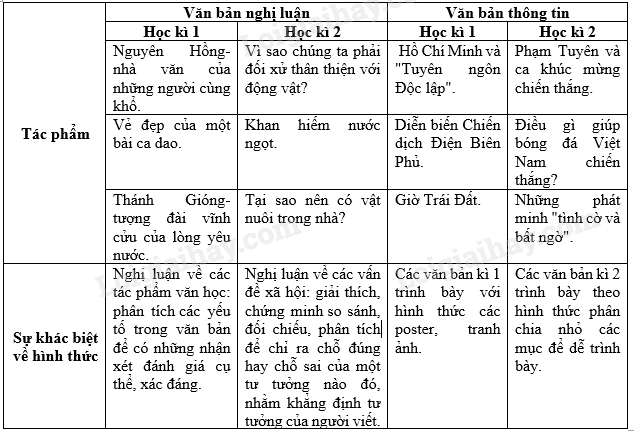 Thống kê các văn bản nghị luận và văn bản thông tin đã học ở hai tập sách Ngữ văn 6, từ đó, nhận xét sự khác biệt về nội dung đề tài của mỗi loại văn bản ở hai tập sách (Gợi ý: Sự khác biệt về nội dung đề tài của văn bản nghị luận là Ngữ văn 6, tập một học về nghị luận văn học; Ngữ văn 6, tập hai hướng dẫn học về nghị luận xã hội).