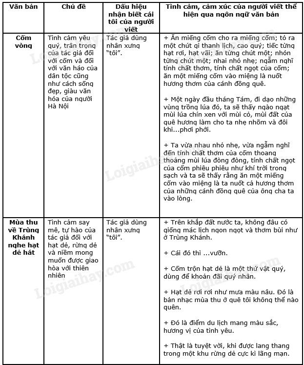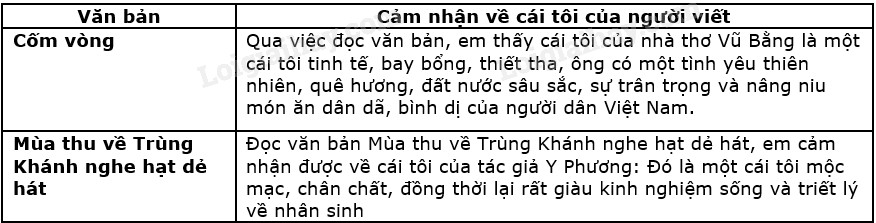 Ghi lại cảm nhận của em về cái tôi của người viết trong văn bản Cốm vòng và Mùa thu về Trùng Khánh nghe hạt dẻ hát theo mẫu bảng sau (làm vào vở):