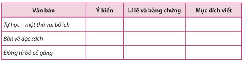 Tìm ý kiến, lí lẽ, bằng chứng và mục đích của từng văn bản để hoàn thành bảng.