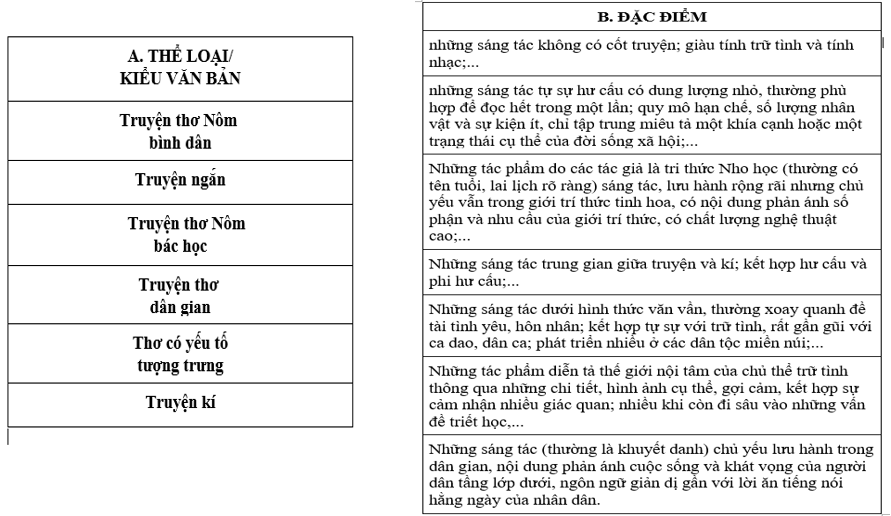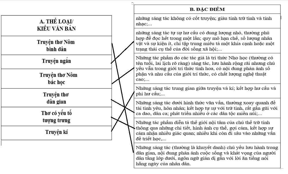 Kẻ vào vở hai cột A, B theo mẫu dưới đây, sau đó nối tên thể loại ở cột A với đặc điểm phù hợp được nêu ở cột B; giải thích lí do bạn tạo ra các đường nối giữa hai cột A và B