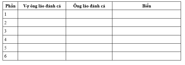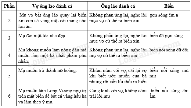 Hãy liệt kê ra vở những chi tiết thể hiện sự đòi hỏi, thái độ, hành động của vợ ông lão đánh cá; phản ứng của ông lão đánh cá và trạng thái của biển trong các phần 2,3,4,5,6 theo gợi ý sau: