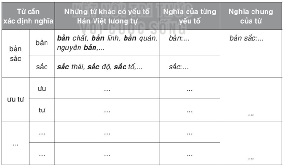 Bản sắc, ưu tú, truyền thông là các từ có yếu tố Hán Việt. Lập bảng theo mẫu được gợi ý sau đây để xác định nghĩa của chúng: