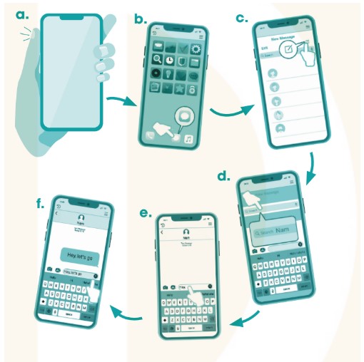 1. Match the following instructions with suitable pictures. Then use First, Next, Then, After that, Finally to give complete instructions about how to send texts with a smartphone.