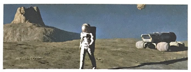 (Cảnh này dường như mô tả quang cảnh trên sao Hỏa. Phi hành gia dường như đang đi bộ hoặc chuẩn bị thu thập mẫu vật.)