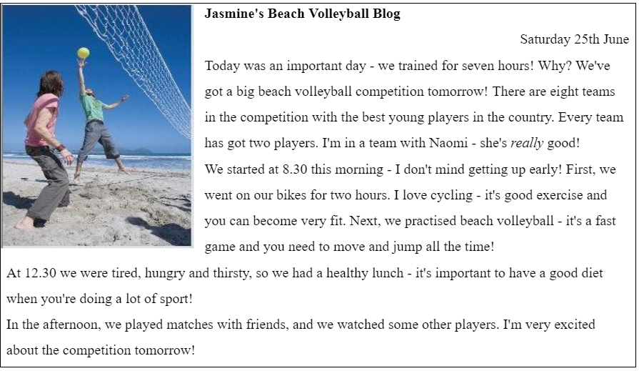 Hôm nay là một ngày quan trọng - chúng tôi đã tập luyện trong bảy giờ! Tại sao? Chúng tôi có một cuộc thi bóng chuyền bãi biển lớn vào ngày mai! Có tám đội tham gia tranh tài với các cầu thủ trẻ xuất sắc nhất trong nước. Mỗi đội đều có hai cầu thủ. Tôi ở trong đội với Naomi - cô ấy thực sự rất giỏi!