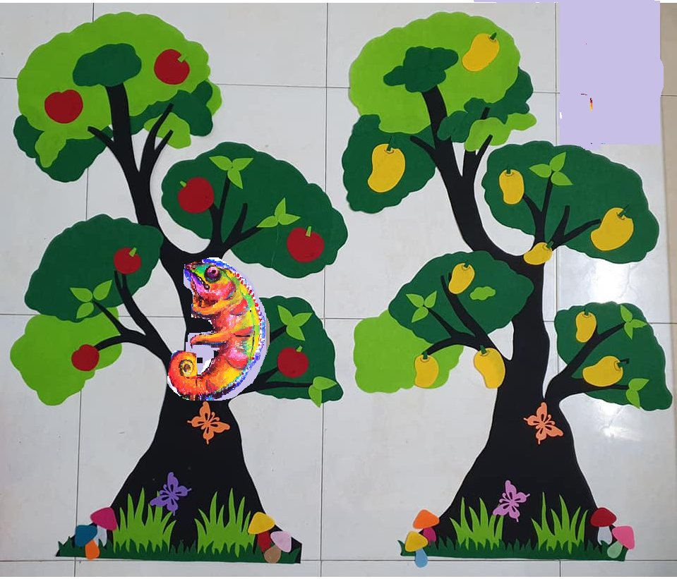 - dán hình chú tắc kè hoa vào bức tranh rừng cây: