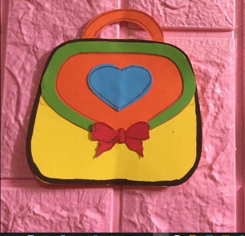 Em tạo hình chiếc cặp có nơ đỏ, thân cặp màu vàng