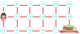 Bạn Hà cần tìm đường đến siêu thị. Biết rằng Hà chỉ có thể đi qua ô có chứa số chia hết cho 2 hoặc chia hết cho 3 và mỗi ô chỉ đi qua một lần. Em hãy giúp Hà đến được siêu thị nhé.