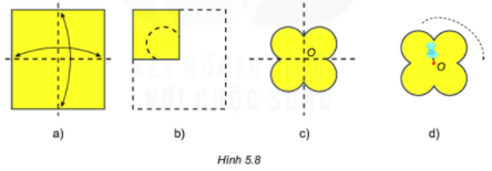 Mở phần cắt được ra ta có một hình bông hoa bốn cánh (1.5.8c).Gọi giao điểm của hai nếp gấp là O. Cố định điểm O bằng đinh ghim để có thể quay hình đó quanh 0.