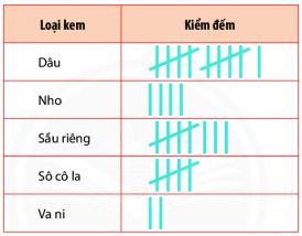 Nhà bạn Mai mở tiệm kem, bạn ấy muốn tìm hiểu về các loại kem yêu thích của 30 khách hàng trong sáng chủ nhật và thu được kết quả như sau: