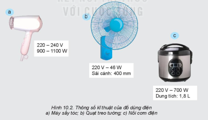 Đọc thông số kỹ thuật của các đồ dùng điện cho hình 10.2 cho biết các đại lượng điện định mức và thông số kỹ thuật đặc trưng của chúng.