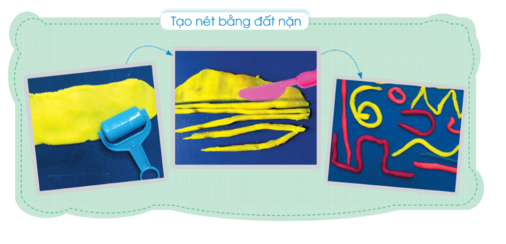 Em có thể dùng dao, con lăn để cắt và tạo ra các nét từ đất nặn. Em cũng có thể dùng bút màu để tạo nên đường thẳng, cong, móc tùy thích.