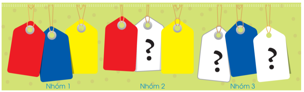 Quan sát cách sắp xếp màu sắc ở nhóm 1 và gọi tên các màu còn thiếu ở nhóm 2 và nhóm 3