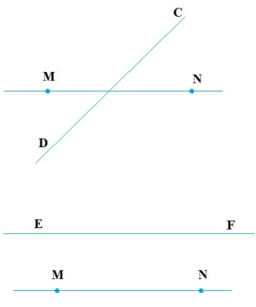 - Nếu hai đường thẳng chỉ có một điểm chung, ta nói rằng hai đường thẳng đỏ cắt nhau. Điểm chung được gọi là giao điểm của hai đường thẳng.