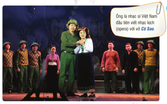 Quan sát hình ảnh trong vở nhạc kịch Cô Sao và cho biết cô Sao là người dân tộc nào? Hãy hát một câu trong các ca khúc của nhạc sĩ Đỗ Nhuận mà em biết.