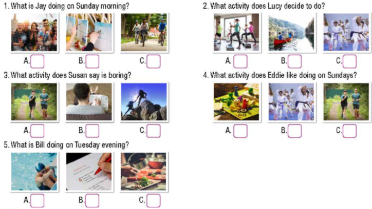 (Jay làm gì vào sáng Chủ nhật? - Đi xe đạp.)