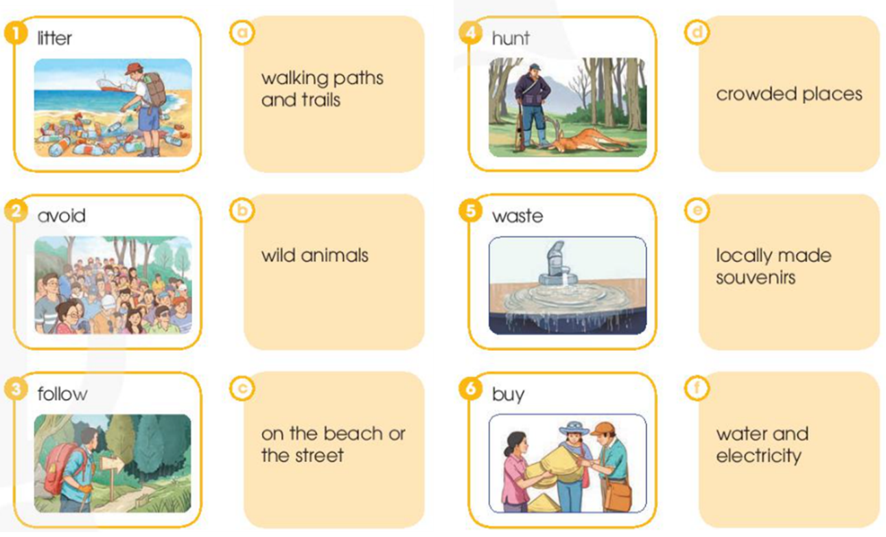 1. Match each verb on the left with a phrase on the right. Use the pictures to help you. 2. Work in pairs. Discuss which of the things in 1 we should or should not do to become ecotourists. Use the expressions below to help you. 3. Work in groups. Talk about what tourists should or should not do if they are on an ecotour to a tourist attraction in your local area. Use the discussion questions below to help you. 4. Share your ideas with the whole class. Vote for the best ideas.