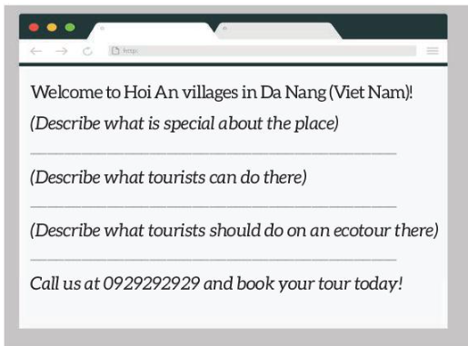 3. Write a website advertisement (120 - 150 words) for an ecotour to Hoi An villages. Use what you have learnt in 1 and 2 and the suggested outline below to help you.