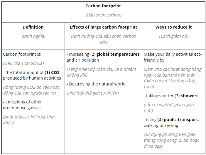 (Làm việc theo cặp. Thảo luận về những điều bạn có thể làm để giảm dấu chân carbon của mình.)