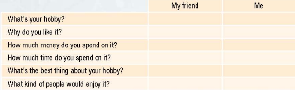 a. You are talking to a new classmate about hobbies. In pairs:Ask your partner and fill in the table with their answers.