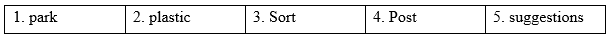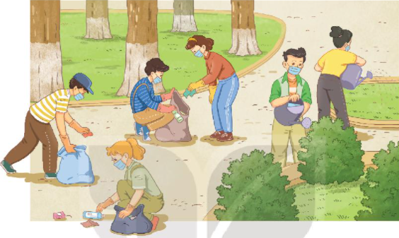 Clean the central (1) park (Làm sạch công viên trung tâm) - Pick up rubbish, bottles, and (2) plastic bags (Nhặt rác, chai và túi nhựa) - Water small trees and flowers (Tưới cây nhỏ và hoa) |