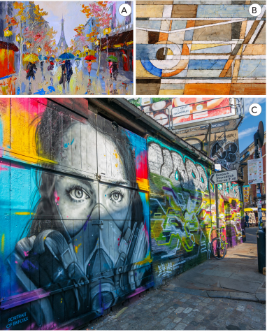 (Tranh A là tranh phong cảnh, tranh B là tranh trừu tượng và tranh C là nghệ thuật đường phố.)