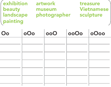 1. Work in pairs. Ask and answer the questions. Use the words and phrases in the table. 2. Listen to a radio program. Which two paintings did Ms. Lam describe? 3. Listen again. Choose the correct answer. 4. Work in pairs. Do you like the paintings by Tô Ngọc Vân? Why (not)? 5. Put the words below into the correct column that shows their stress pattern. Listen and check.