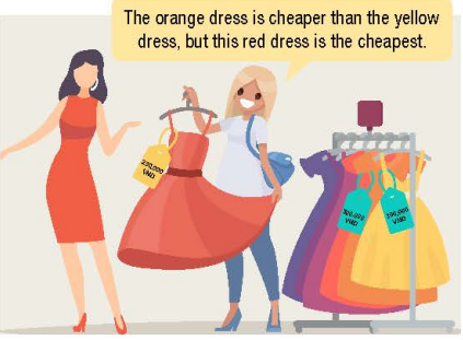 (Chiếc váy màu cam rẻ hơn chiếc váy màu vàng, nhưng chiếc váy màu đỏ này là rẻ nhất.)